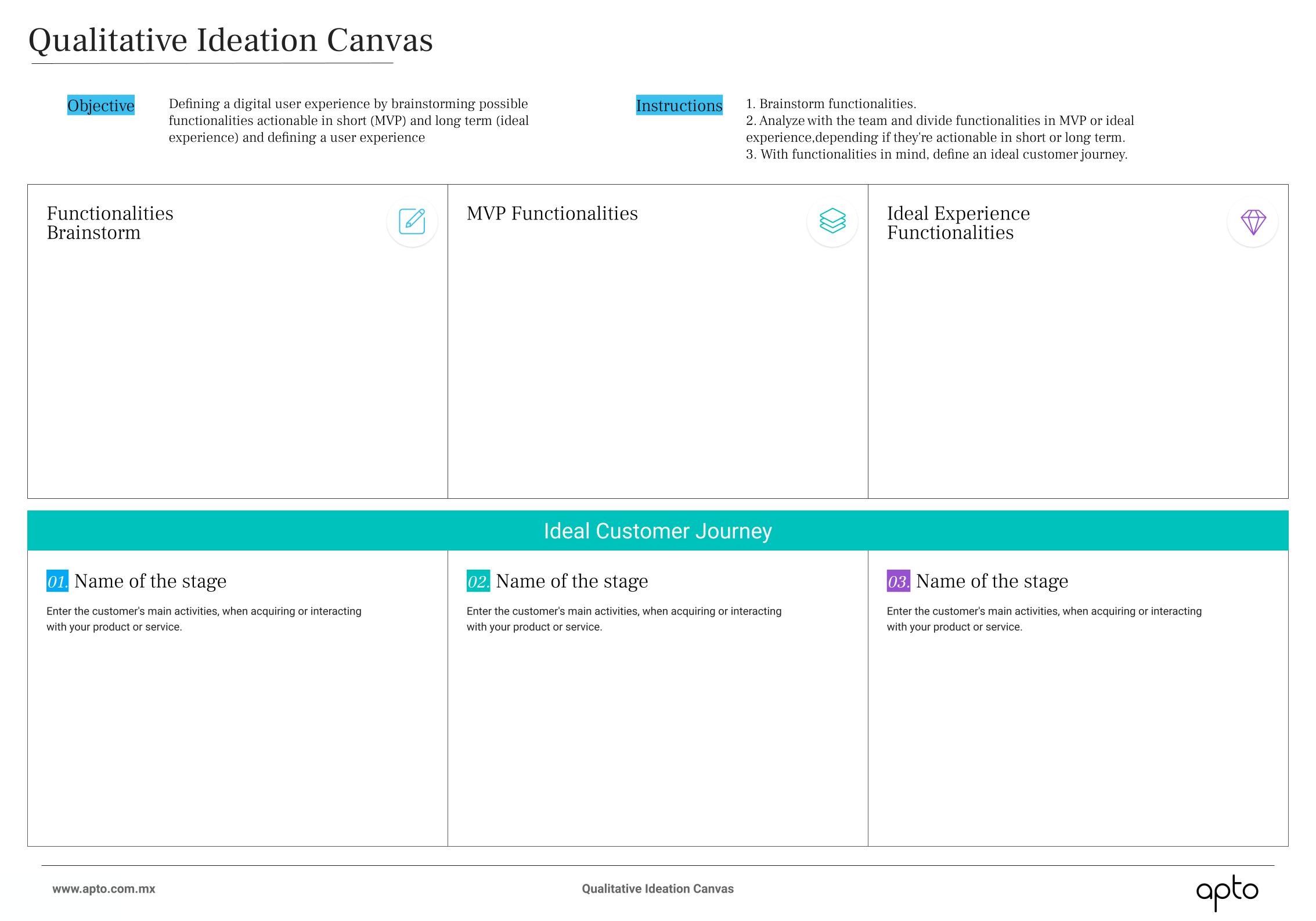 El Qualitative Ideation Canvas es una herramienta que facilita la generación y organización de ideas durante el proceso de diseño e innovación. Se enfoca en aspectos cualitativos, como las percepciones, experiencias y sentimientos de los usuarios, en lugar de solo datos cuantitativos. El canvas ayuda a estructurar y visualizar ideas relacionadas con los problemas, oportunidades y soluciones potenciales basadas en la comprensión profunda del usuario. En el proceso de innovación y diseño, el Qualitative Ideation Canvas permite a los equipos explorar ideas de manera más creativa y empática, asegurando que las soluciones propuestas estén bien fundamentadas en el contexto y las necesidades del usuario. Esto fomenta un enfoque más holístico y centrado en el usuario, facilitando la generación de soluciones innovadoras y relevantes.