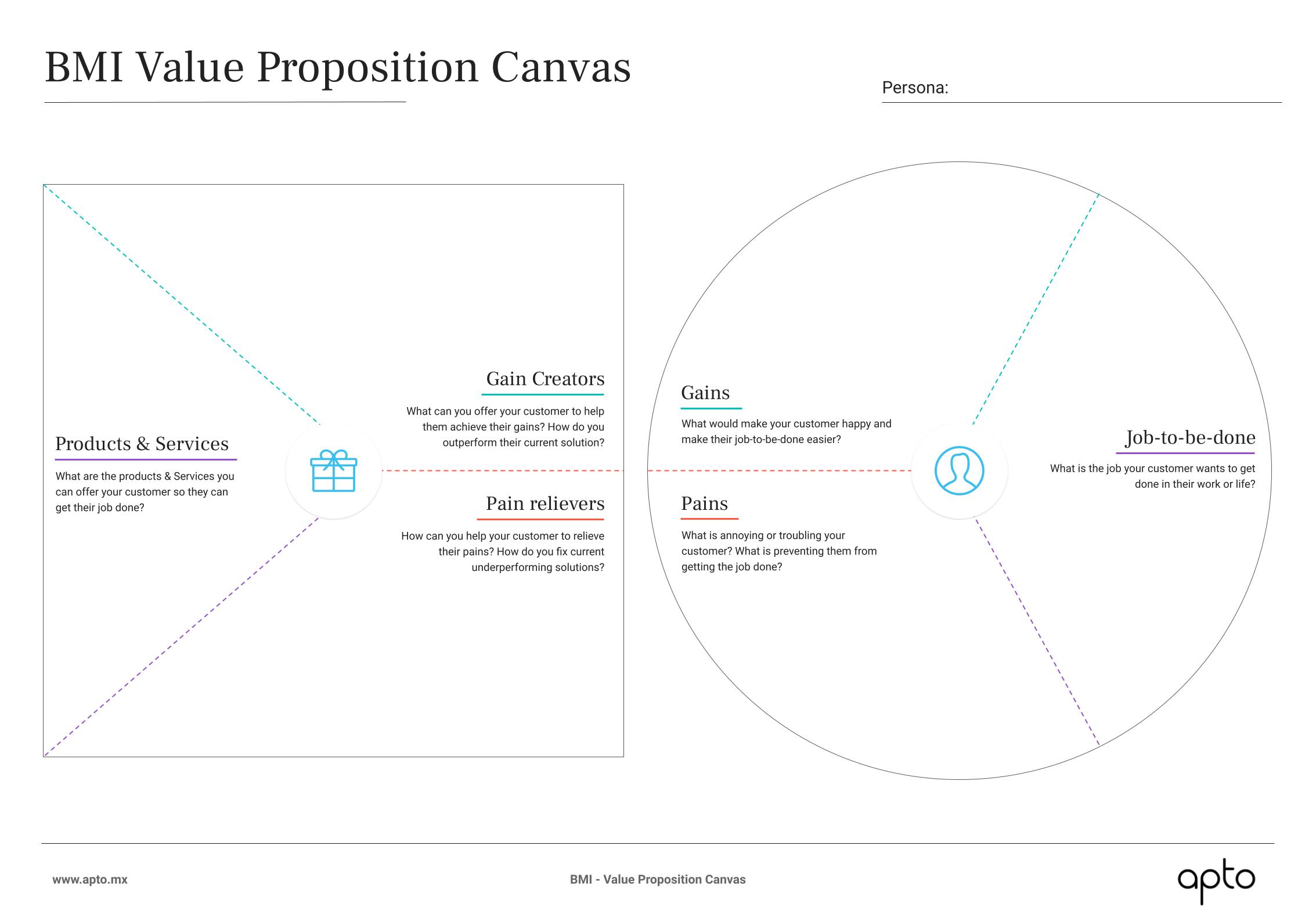 El Value Proposition Canvas es una herramienta diseñada para alinear la propuesta de valor de un producto o servicio con las necesidades y expectativas de los clientes. Se divide en dos partes: el Customer Profile, que describe las tareas, problemas y necesidades del cliente, y el Value Map, que detalla cómo el producto o servicio resuelve esos problemas y satisface esas necesidades. En un proceso de innovación y diseño, el Value Proposition Canvas sirve para garantizar que la propuesta de valor sea relevante y atractiva para los clientes. Ayuda a identificar claramente lo que los clientes valoran y cómo el producto o servicio puede diferenciarse de la competencia, facilitando la creación de soluciones que realmente resuelvan problemas y proporcionen beneficios tangibles a los usuarios.